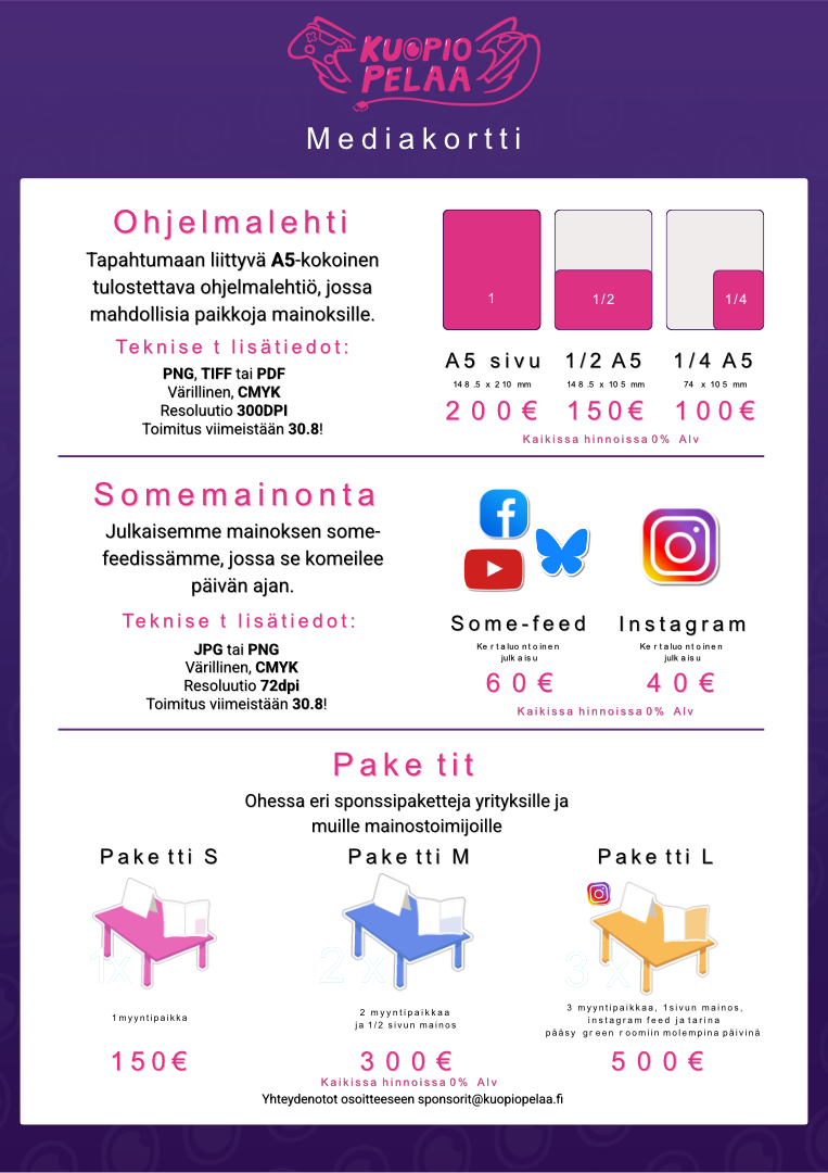 Mikäli valmiista paketeista ei löydy tarpeisiinne sopivaa, voitte olla yhteydessä sponsorivastaavaamme sponsorit@kuopiopelaa.fi ja räätälöimme mielellämme juuri teille sopivan ratkaisun